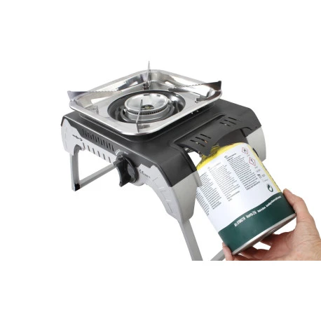 Fornello a gas portatile in accaio inox, con gambe pieghevoli.